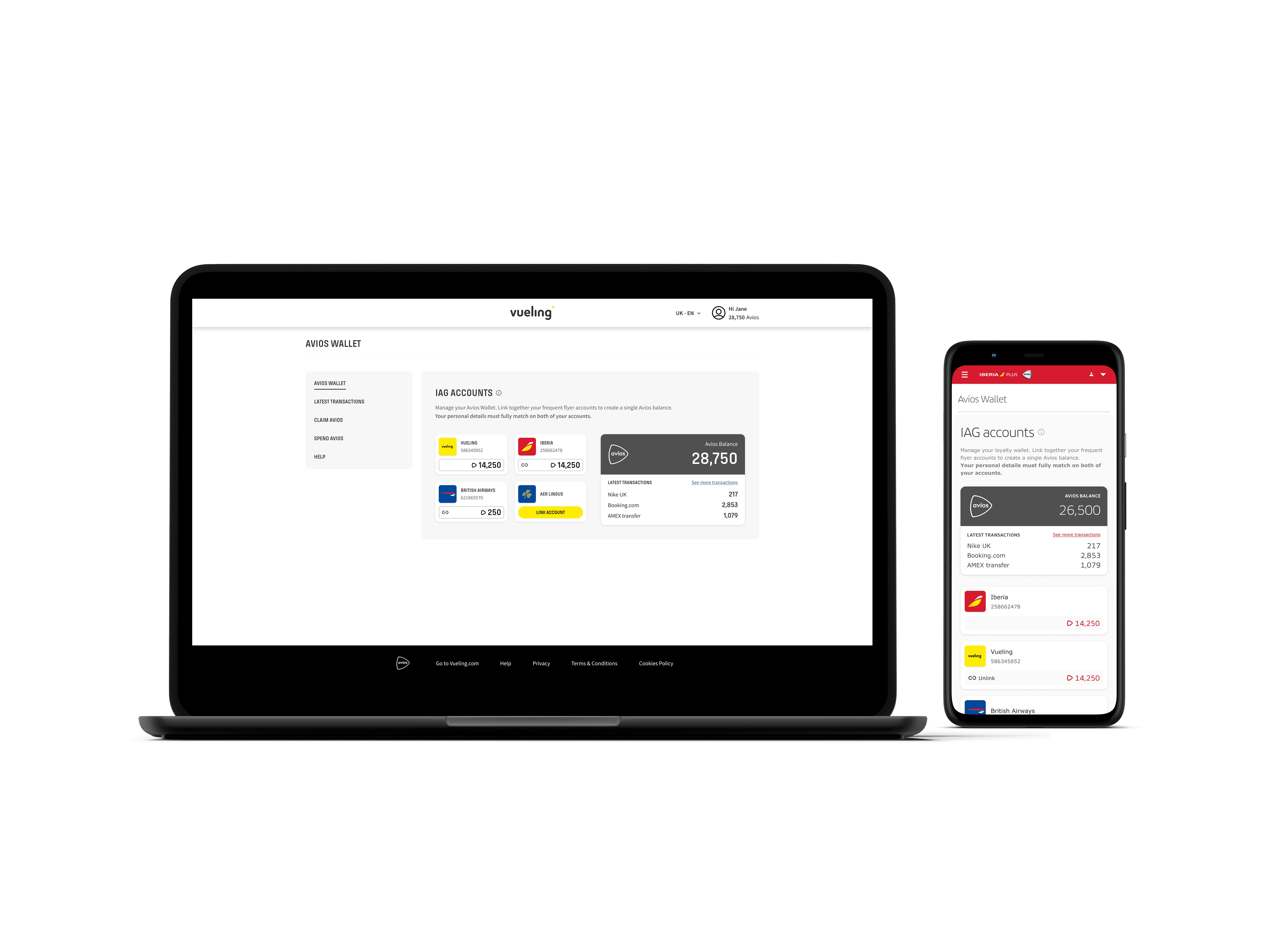 Given that Avios is part of the IAG Loyalty programme, it raised the challenge of designing a unified Avios Wallet experience across all the airline accounts (British Airways, Aer Lingus, Iberia, and Vueling), while preserving each airline's distinct identity. Although the design was standardized, the implementation of the Avios Wallet on each airline's website remains a strategic decision for each airline to make. As Iberia and Vueling were the initial adopters, their versions will be highlighted in this portfolio.